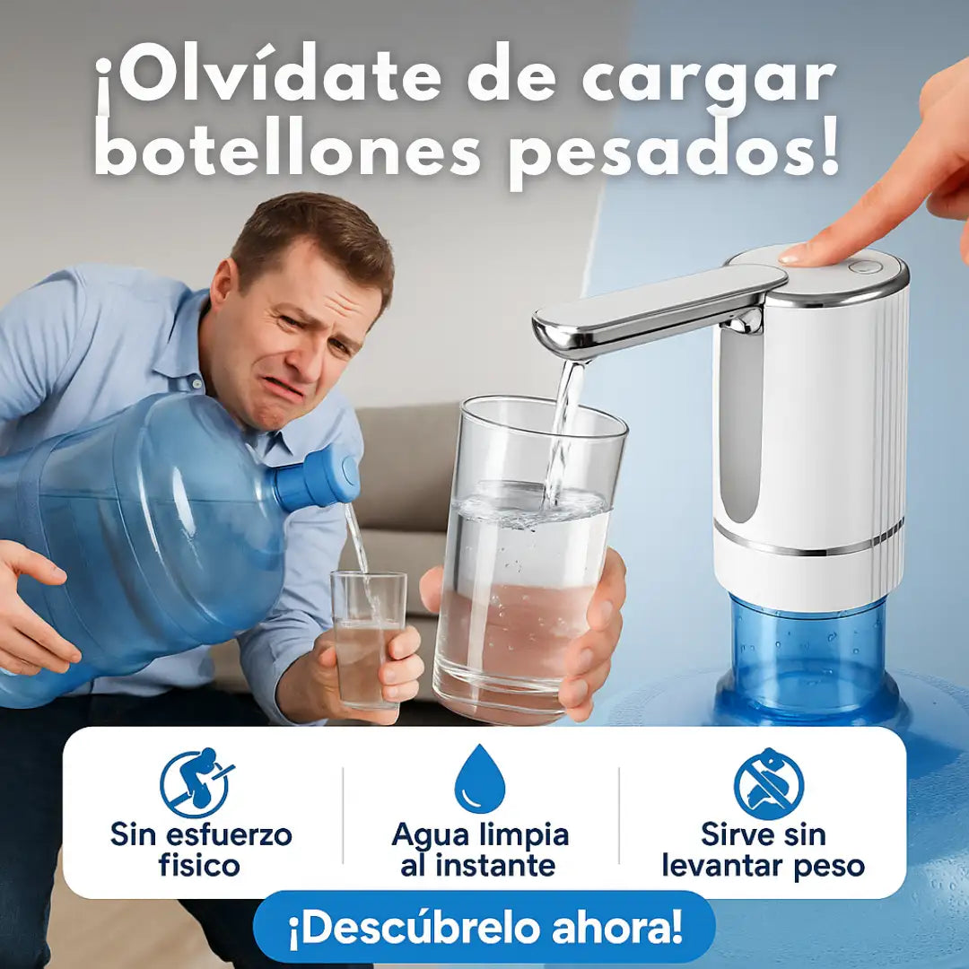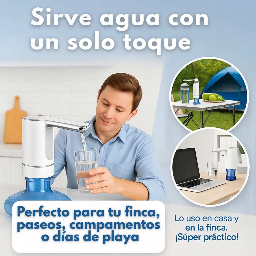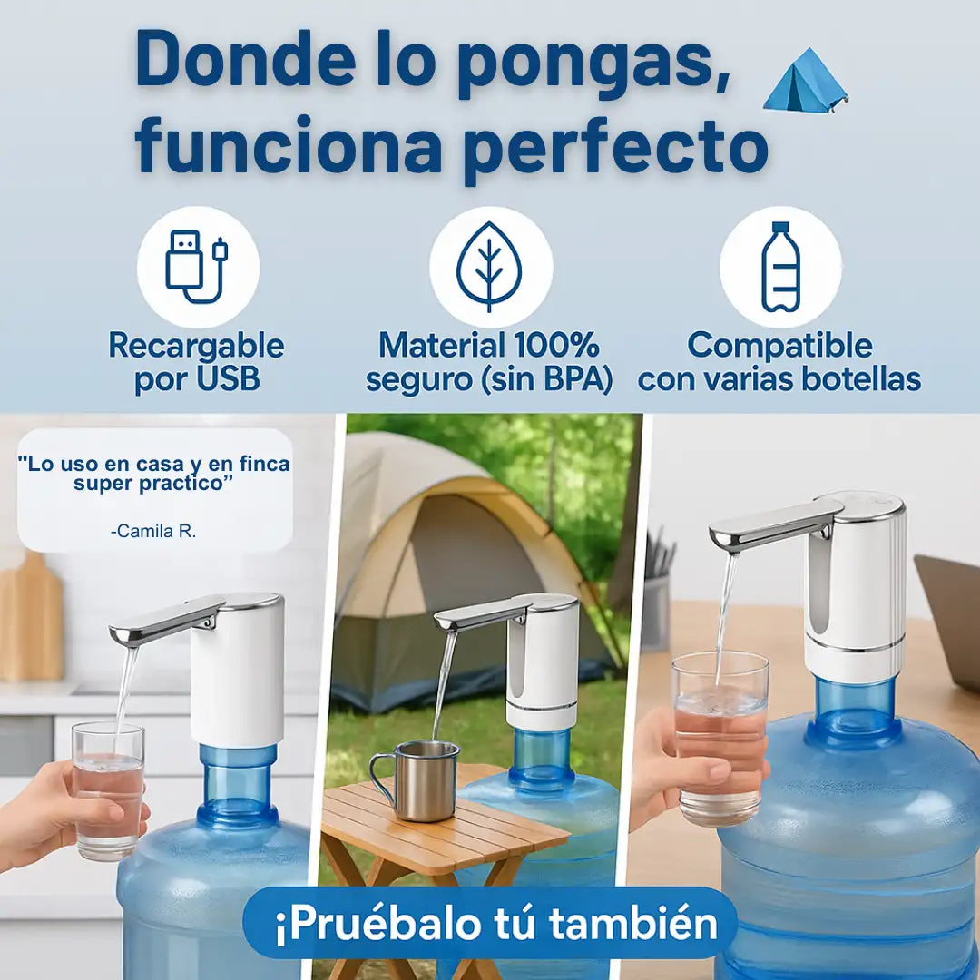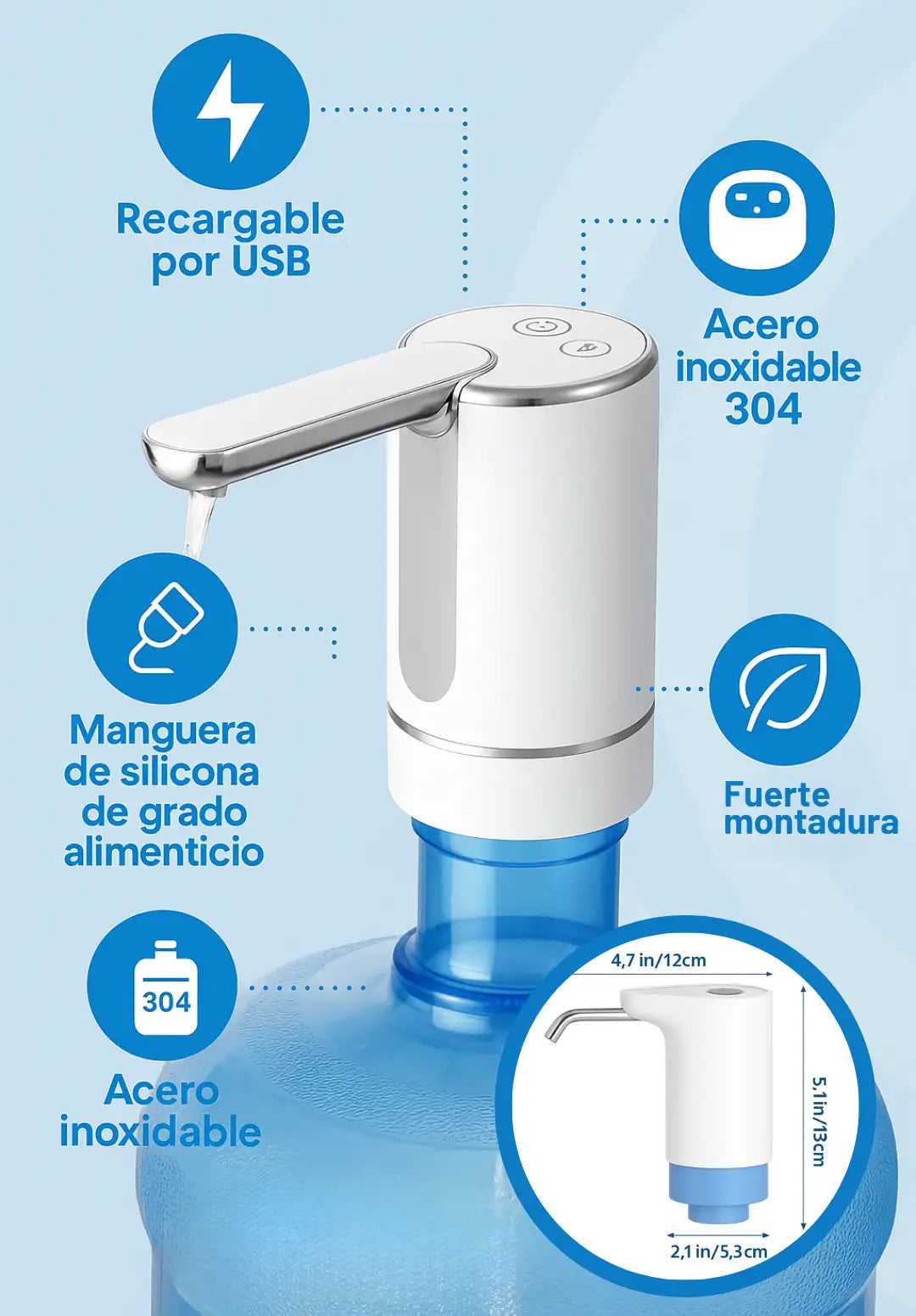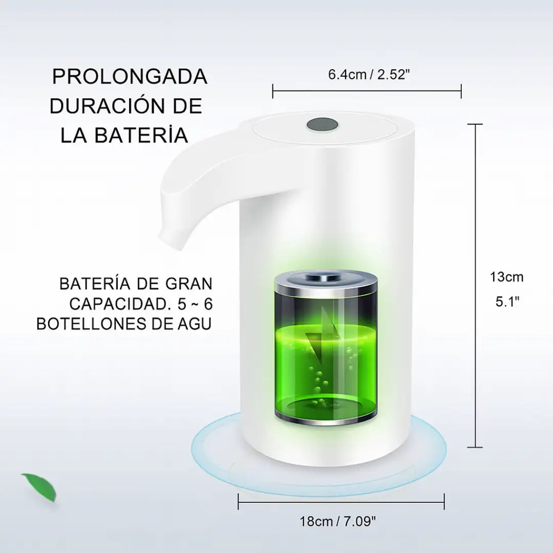 La batería tiene una larga duración y puede despachar hasta 8 garrafones completos con una sola carga. Se recarga fácilmente con cable USB (incluido).