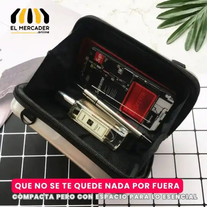 Su diseño innovador te permite llevar desde tus cosméticos y dispositivos electrónicos hasta tus accesorios personales, todo en un solo lugar.