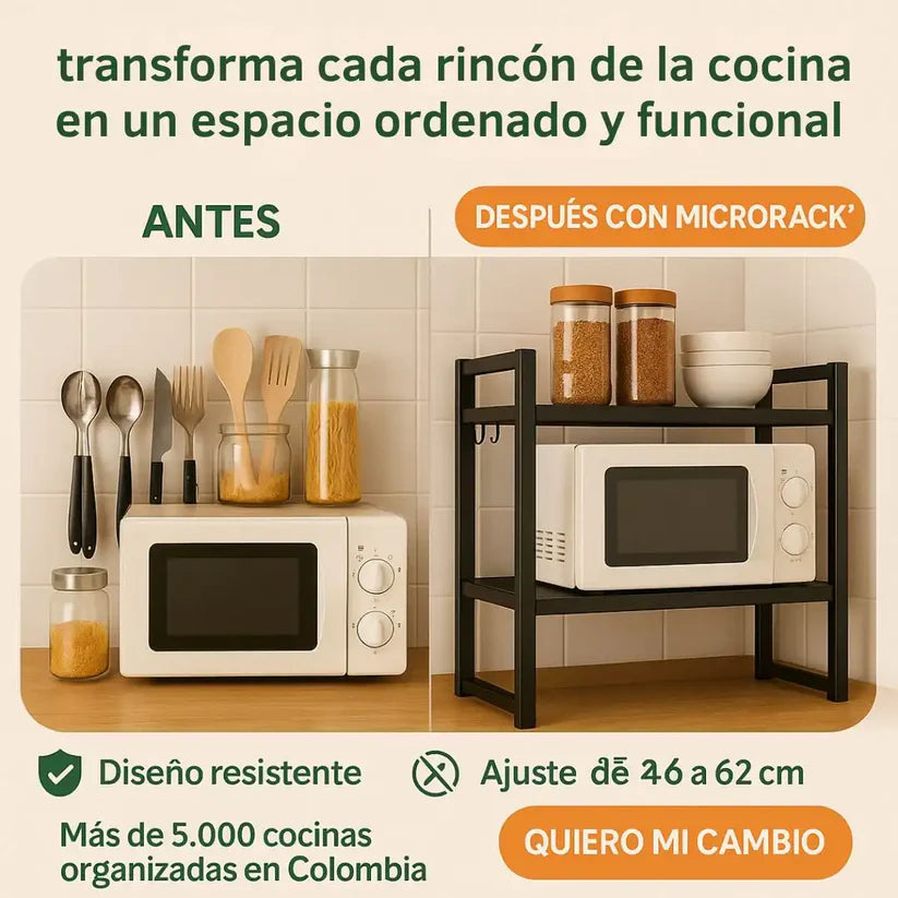 en un espacio ordenado y funcional, ofreciendo una solución resistente y ajustable para su microondas y accesorios de cocina.